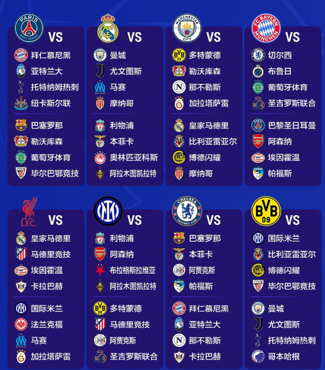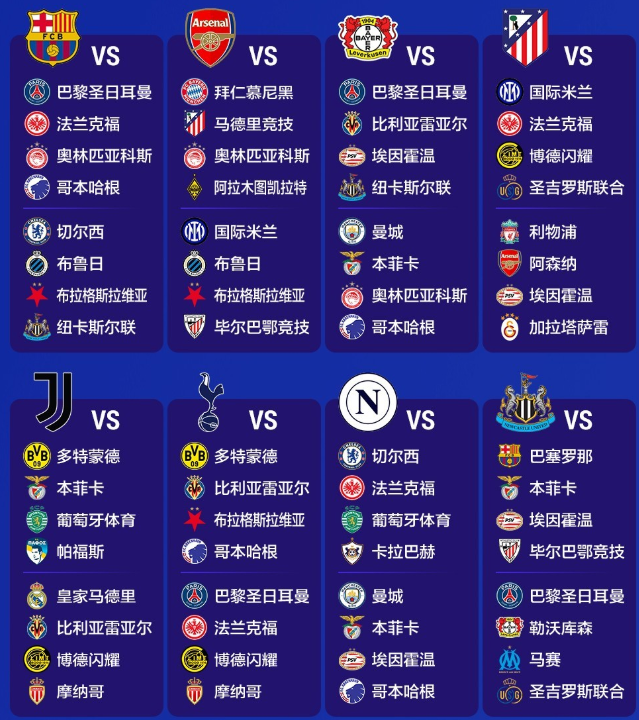 除此之外,拜仁还抽到了阿森纳和切尔西这2支老对手;此前拜仁就已经和枪手有过高达14次交手的纪录。切尔西则是在2012年欧冠决赛击败拜仁,获得队史首座欧冠冠军。而签运最差的当属卫冕冠军大巴黎;这家法甲豪门的对手包括巴萨、拜仁、亚特兰大、纽卡、热刺、勒沃库森、毕尔巴鄂竞技和葡萄牙体育,几乎没有一个善茬。